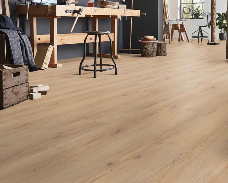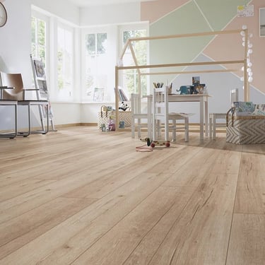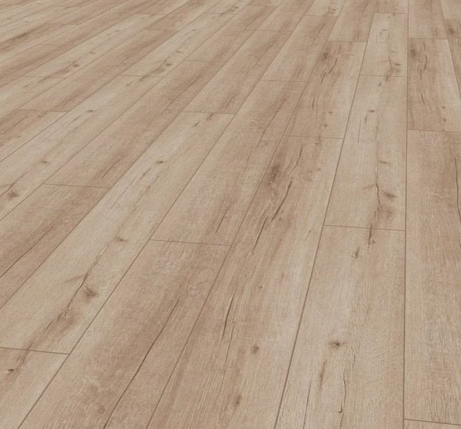 This RIP Oak Effect Laminate Flooring with fantastic Wood design, natural light beige tones. THIS LAMINATE BOASTS A BRILLIAN TEXTURED FEEL UNDERFOOT WITH ITS EMBOSSED SURFACE. THIS IS A SCRATCH RESISTANT SURFACE THAT ALLOWS TO FIT IT EVERYWHERE FROM LIVING ROOMS AND HALLS TO SOME COMMERCIAL AREA